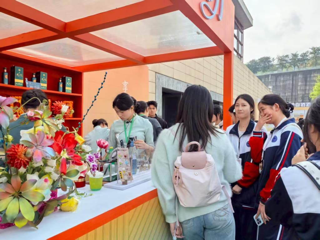 走进“龙涧特调”展位,酒香四溢,学生们手法娴熟,量酒、摇壶、装饰,一气呵成。与以往使用外购基酒不同,此次特调的所有基酒均产自学校生产性实训基地——龙涧酒博园。从粮食发酵、蒸馏取酒到陈酿勾调,学生既是酿酒工艺的“见证者”,也成为美酒二次创新的“演绎者”。这一杯特调背后,串联起的是从“生产端”到“服务端”的全产业链实训链条。